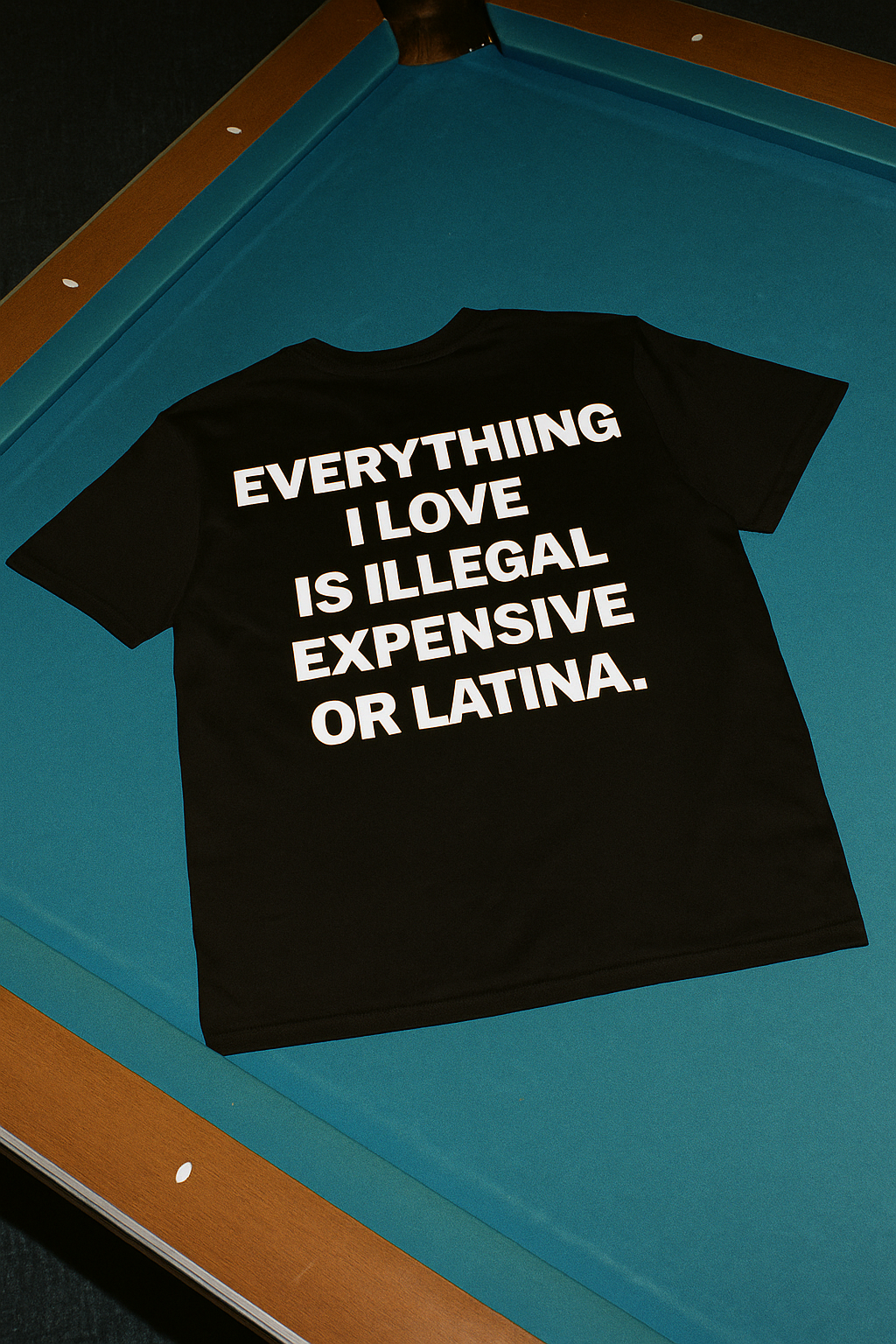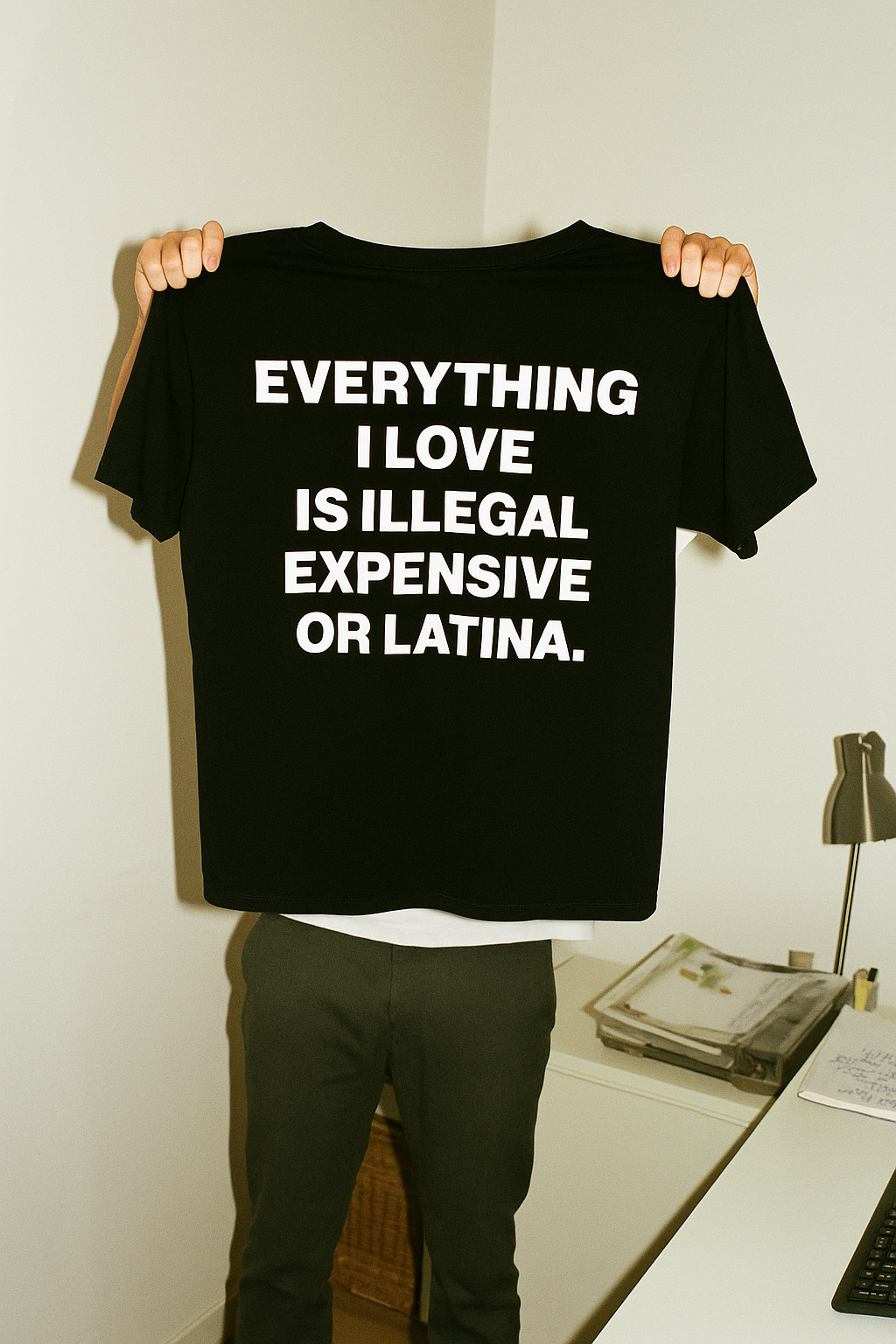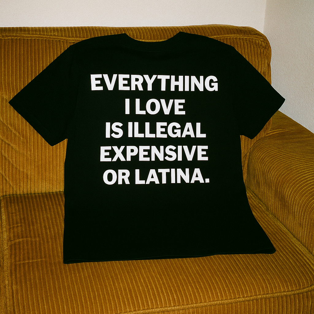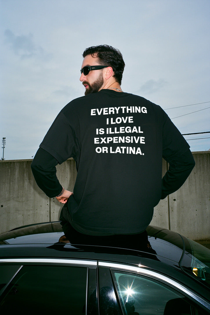 Black oversized tee with bold white back print: 'EVERYTHING I LOVE IS ILLEGAL, EXPENSIVE OR LATINA.' Made from soft cotton for everyday comfort, it brings a mix of streetwear attitude and unapologetic style. Perfect for those who live fast and don’t care about rules.